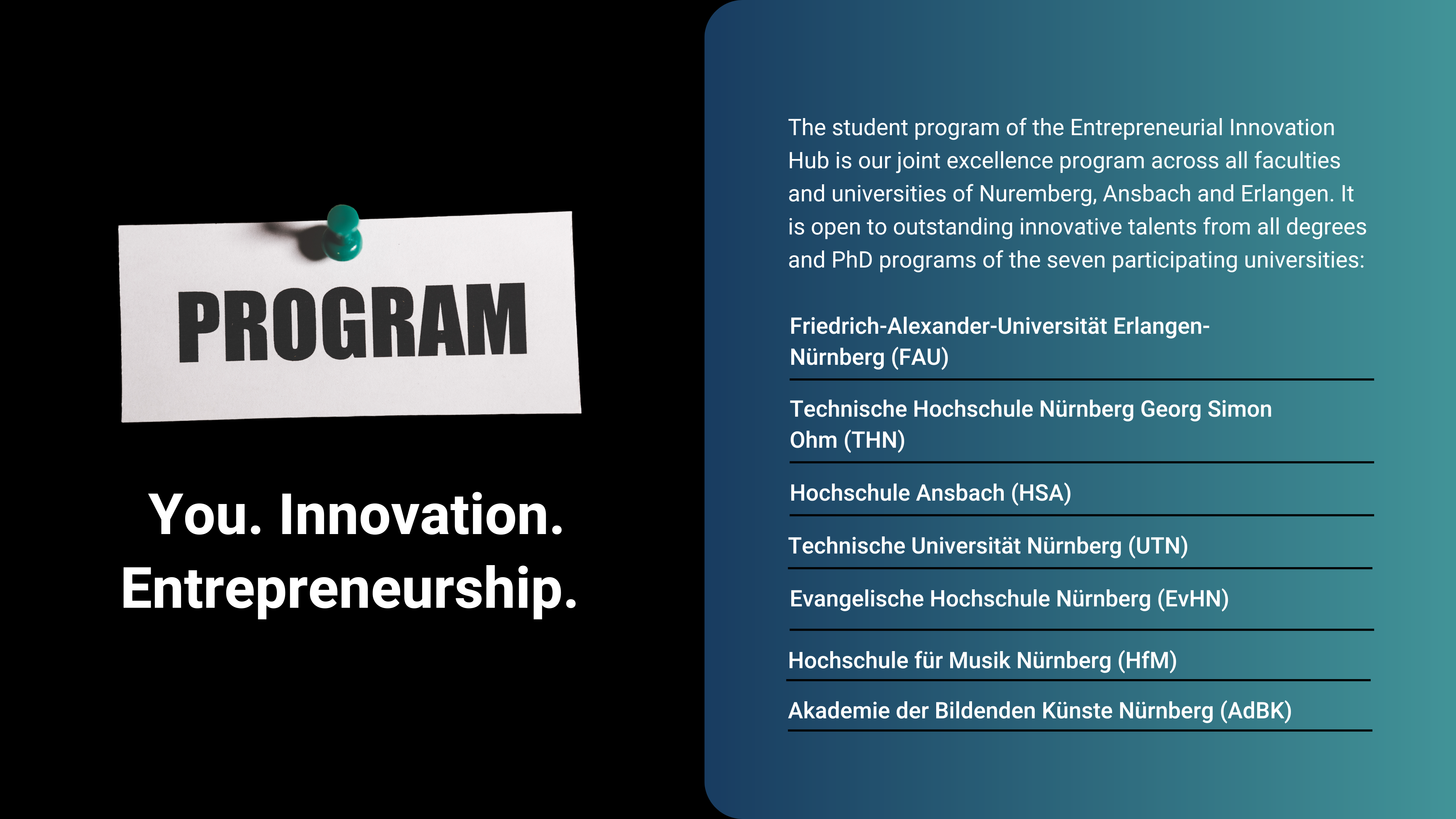 We offer you everything you need in order to follow your heart and your passion for innovation and entrepreneurship. Work in interdisciplinary teams, get in touch with expert coaches and mentors, develop your own original and validated business model for your start-up and become a part of our Franconian and international innovation ecosystem, start-up network and community.
